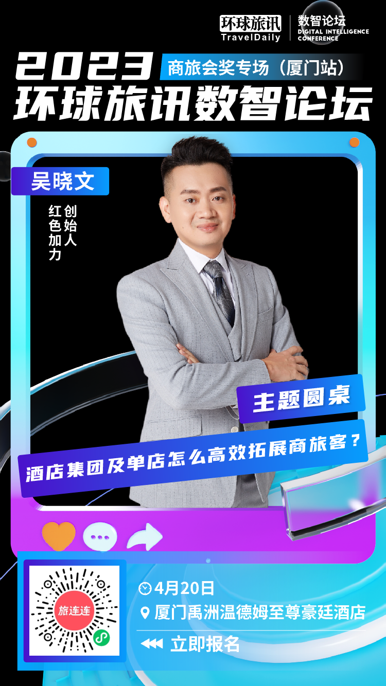 2023 环球旅讯数智论坛(厦门站)将于4月20日在厦门禹洲温德姆至尊豪庭酒店举办,活动倒计时3天!红色加力CEO吴晓文受邀参加本次论坛,将参与《酒店集团及单店怎么高效拓展商旅客》为主题的圆桌讨论。红色加力在本次论坛中也设有展台,非常期待与业界伙伴共同交流学习,提升服务品质,共同进步。环球旅讯数智论坛 · 酒店专